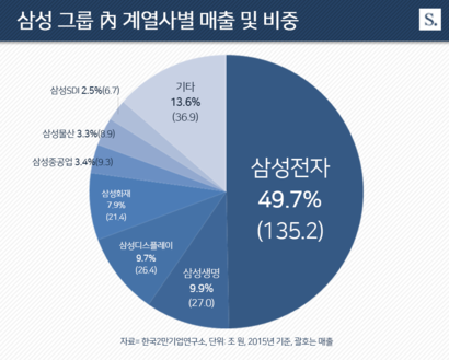 31일 한국2만기업연구소가 발표한 '2015년 삼성그룹 국내 계열사 경영 현황 분석'에 따르면 삼성전자의 지난해 매출은 135조 2050억원으로 삼성그룹 전체 매출 271조 8800억원의 49.7%에 달했다. 여기에 삼성디스플레이(9.7%), 삼성SDI(2.5%), 삼성전기(1.9%) 등 전자업종 계열사 매출을 합하면 총매출은 184조 181억원으로 그룹 매출의 67.6%나 된다.