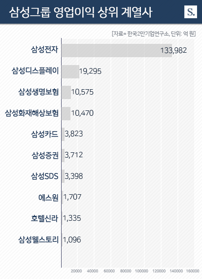 영업이익을 보면 삼성전자 비중이 더욱 높아진다. 삼성전자는 지난해 13조 3982억원의 영업이익으로 그룹 전체 이익 19조 2883억원의 69.5%를 차지했다. 삼성전자와 함께 삼성디스플레이(1조 9295억원), 삼성생명(1조 575억원) 삼성화재(1조 470억원)도 영업이익 1조를 넘겼다.