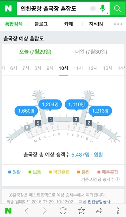 네이버는 인천국제공항과 함께 출국장별 예상 혼잡도 실시간 정보를 제공하기 시작했다. 이용자들은 네이버 모바일 검색창에 인천공항 출국장 또는 혼잡정보를 검색해 출국장별 혼잡도와 예상 이용객 수를 확인할 수 있다.
