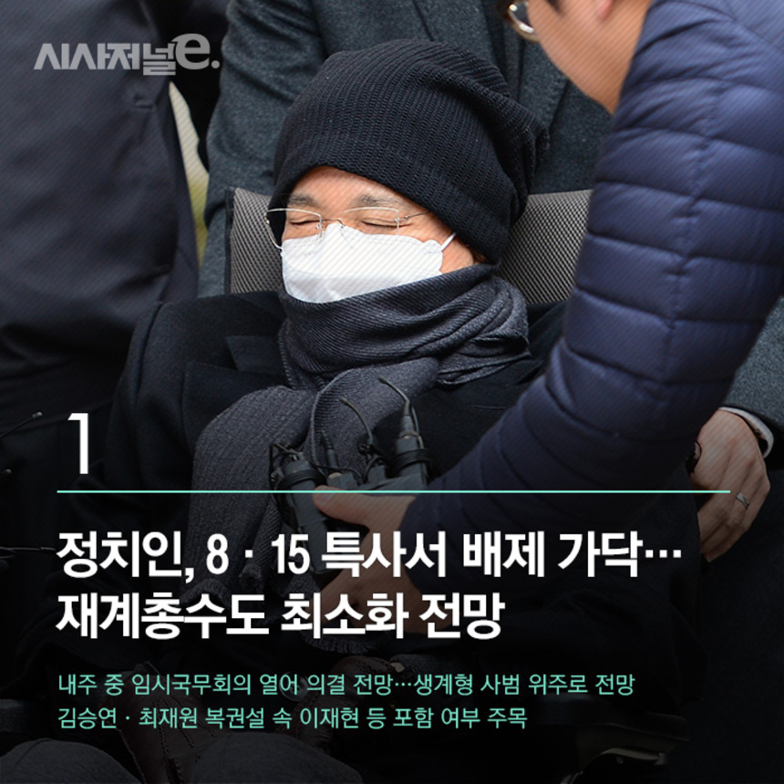 정치인, 8·15 특사서 배제 가닥… 재계총수도 최소화 전망 저작권자 © 시사저널e 무단전재 및 재배포 금지 김재일 기자 kojell@sisajournal-e.com 페이스북 인스타그램 유튜브 이메일(으)로 기사보내기 다른 공유 찾기 기사스크랩하기