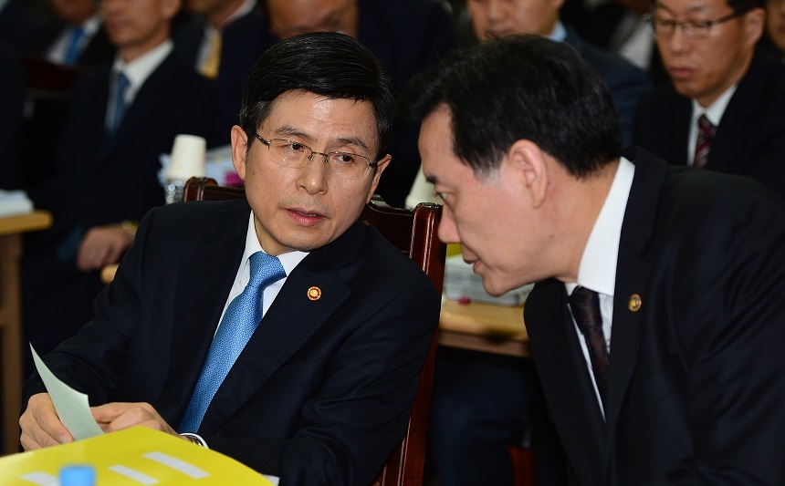 황교안 당시 법무부 장관(현 국무총리·사진 왼쪽)이 2014년 10월 정부과천청사에서 열린 법무부에 대한 국회 법제사법위원 국정감사에서 김현웅 당시 차관(현 장관)과 이야기를 나누고 있다. / 사진=뉴스1