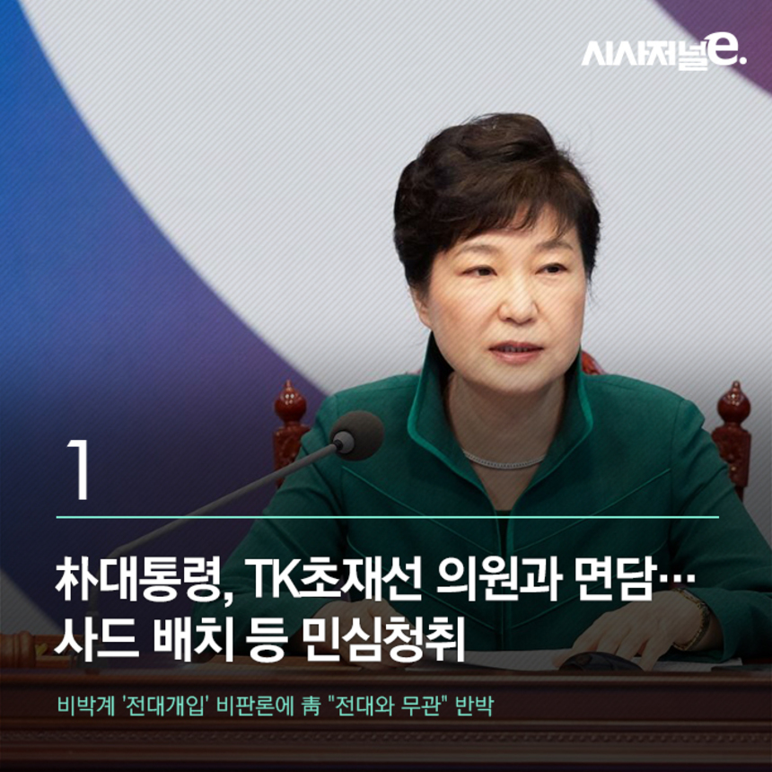 朴대통령, TK의원 11명 면담…靑 "사드민심 청취" 저작권자 © 시사저널e 무단전재 및 재배포 금지 김재일 기자 kojell@sisajournal-e.com 페이스북 인스타그램 유튜브 이메일(으)로 기사보내기 다른 공유 찾기 기사스크랩하기 개의 댓글 회원로그인 댓글 내용입력 댓글 정렬 최신순 추천순 답글순 BEST댓글 BEST 댓글 답글과 추천수를 합산하여 자동으로 노출됩니다. 닫기 더보기 댓글삭제 삭제한 댓글은 다시 복구할 수 없습니다. 그래도 삭제하시겠습니까? 비밀번호 닫기 댓글수정 댓글 수정은 작성 후 1분내에만 가능합니다. 본문 / 400 비밀번호 닫기 내 댓글 모음 닫기