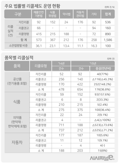 리콜 유형별로 보면 리콜명령이 전체의 절반 이상(56.1%)인 890건을 차지했다. 자진리콜은 2013년 263건, 2014년 339건, 2015년 536건으로 꾸준히 증가세를 보였다. 공정위는 자진리콜 증가에 대해 "소비자 안전에 대한 사회적 관심이 높아진 점에 더해 결함제품의 자발적 리콜을 통해 긍정적 이미지를 구축하려는 기업 노력 등에 따른 것"이라고 분석했다.