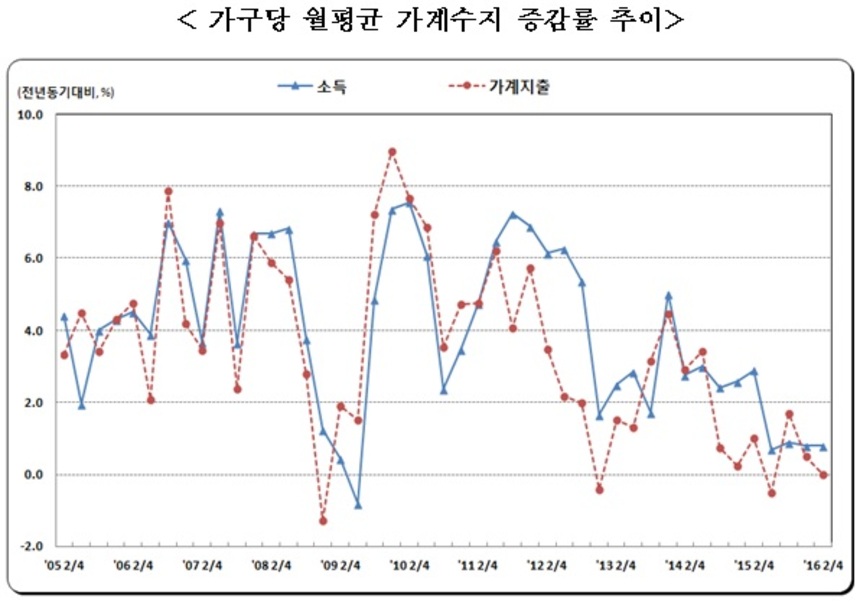 통계청이 19일 발표한 ‘2016년 2분기 가계동향’에 따르면 2분기 가구당 월평균 소득은 430만6000원으로 전년동기대비 0.8% 증가했다. 물가상승을 제외한 실질소득은 전년동기와 동일했다. 근로소득(1.9%), 사업소득(0.2%), 이전소득(3.8%) 등은 증가했다. 반면 이자소득 등이 줄며 재산소득은 (-9.8%) 감소했다.