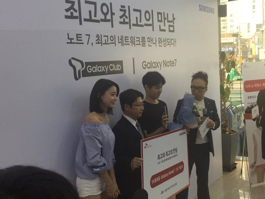 다른 고객들도 아침부터 매장 앞에 줄을 섰다. SK텔레콤은 이날 강남 직영점 매장에서 갤럭시노트7을 구매하는 고객을 대상으로 연예인 박명수, 헬로비너스와 만화가 이말년, 기안84 사인회도 열었다.