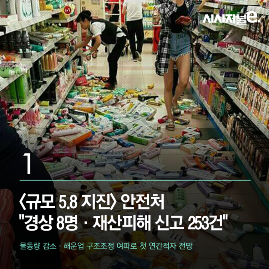 <규모 5.8 지진> 안전처 "경상 8명·재산피해 신고 253건" 저작권자 © 시사저널e 무단전재 및 재배포 금지 김재일 기자 kojell@sisajournal-e.com 페이스북 인스타그램 유튜브 이메일(으)로 기사보내기 다른 공유 찾기 기사스크랩하기 개의 댓글 회원로그인 댓글 내용입력 댓글 정렬 최신순 추천순 답글순 BEST댓글 BEST 댓글 답글과 추천수를 합산하여 자동으로 노출됩니다. 닫기 더보기 댓글삭제 삭제한 댓글은 다시 복구할 수 없습니다. 그래도 삭제하시겠습니까? 비밀번호 닫기 댓글수정 댓글 수정은 작성 후 1분내에만 가능합니다. 본문 / 400 비밀번호 닫기 내 댓글 모음 닫기