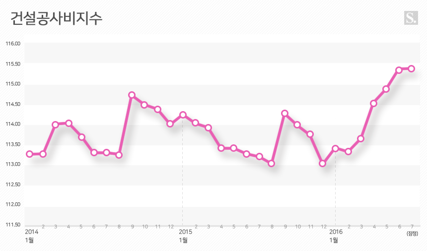 최근 3년간 건설공사비지수는 증가하는 추세다. 지난 2014년 1월 113.29를 기록하며 3년 간 지수가 2.08 올랐다. 한국건설기술연구원 관계자는 “각 연도별 약보합세를 기록하고 있지만 (건설공사비지수가) 꾸준히 증가하고 있다”라고 말했다.