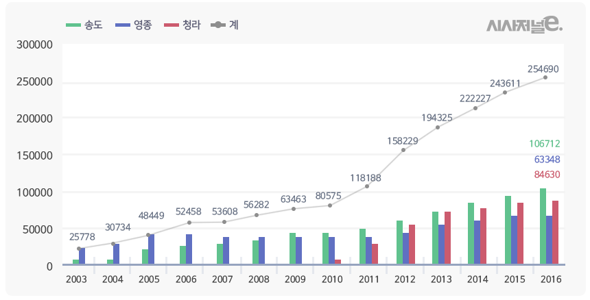 인천경제자유구역청에 따르면, 영종·청라·송도국제도시의 인구는 올해 7월 말 기준 총 25만351명으로 지난 2003년(2만5778명)보다 971% 증가했다.