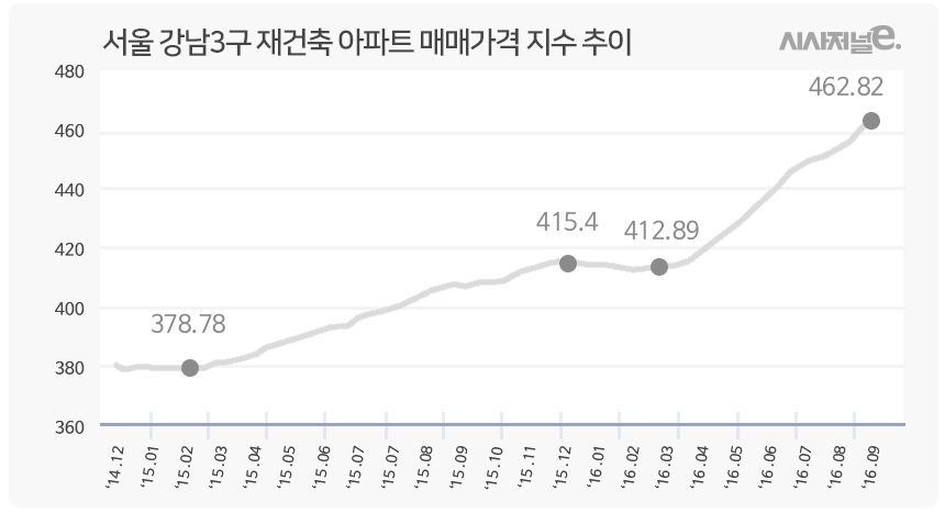 부동산114가 발표하는 아파트가격종합지수인 '코아피(KOAPI)'에 따르면, 상승세를 나타냈던 강남3구 재건축 아파트값이 하락전환(가격조정)됐던 지난 2015년 12월의 매매가격 지수는 415.4로 전저점(2014년 12월 378.78) 대비 9.67% 정도 올랐던 시점이었다. 2016년 9월 현재 강남3구 재건축 매매가격 지수는 462.82로 전저점인 2016년 3월 412.89에 비해 12% 이상 올랐다. 단기간에 훨씬 더 가파른 상승세를 나타낸 것이다.
