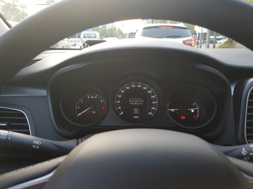 출고한 지 3일이 안된 르노삼성 SM6 가솔린 모델이 오토스탑 기능 작동 이후 브레이크 페달에서 발을 떼자 엔진경고등과 기계식 주차브레이크가 켜지면서 시동이 꺼졌다. / 사진 = 시사저널e