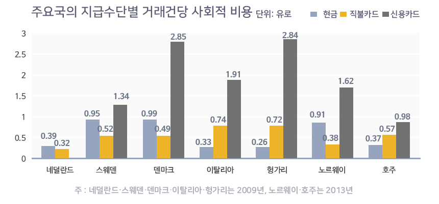 신용카드의 경우 거래건당 사회적 비용이 가장 높았다. 거래 건당 사회적 비용은 현금이 0.26~0.99유로, 직불카드 0.32~0.74유로, 신용카드 0.98~2.85유로 수준으로 신용카드가 가장 높고 다음으로 현금, 직불카드 순이었다.