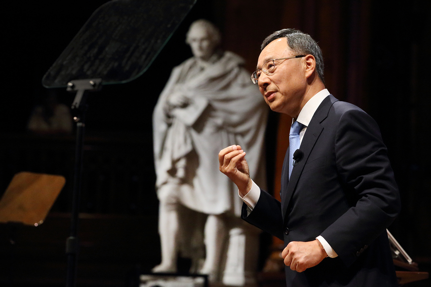 황창규 KT회장이 20일(현지시각) 하버드대 메모리얼 홀에서 이동통신 혁신 전략에 대해 밝혔다. 이날 행사는 하버드대 경영대학원 특강으로 마련됐다.