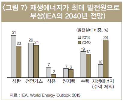 국제에너지기구(IEA)는 세계적으로 발전 설비에서 재생에너지 비중이 2013년 10%(수력 제외)에서 2040년에 28%로 최대 발전원이 될 것으로 전망하고 있다.