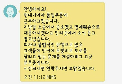 지난 8월이었다. 결함 문건을 두고 고민하다가 현대차 수뇌부와 연이 닿는 변호사를 통해 이 문제를 알렸다. 해결책을 모색하고 대처하라는 뜻이었다. 하지만 모 부회장이 내 뜻을 오해했다. 마치 공갈협박 하냐는 식이었다. 그러더니 한 달 뒤 이렇게 (내부고발에 따른 리콜은폐 의혹이) 터진 것이다.