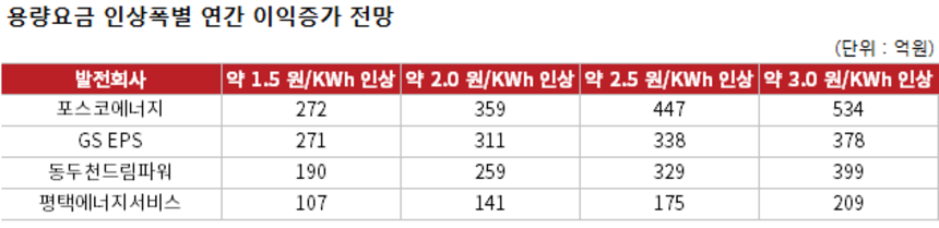 오수아 한신평 기업본부평가4실 책임연구원은 "킬로와트당 7.6원인 용량요금이 11원으로 오르면 안정적인 수익성을 보여줄 수 있을 것"이라며 "다만 누진제 등 요금 인상에 부정적인 사회분위기를 고려하면 인상폭을 가늠하기는 어렵다"고 설명했다.