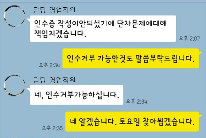 김 씨는 인수증에 서명하는 대신 해당 차량을 판매한 영업직원에게 전화를 걸었다. 돌아오는 답은 명쾌했다. 담당 영업직원은 “단차는 단순 조정으로 가능하다”며 “서울에서 확인 후 인수거부를 결정해도 되니 시간이 날 때 언제든 가져오라”고 말했다. 그는 또 “인수증에 서명하지 않았기 때문에 인수 거부하는데 문제없다”며 “자신이 책임지겠다”고 단언했다.
