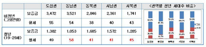 특히 올해 2분기 자치구별 전월세 전환율을 적용해 순수월세로 환산한 뒤 이를 연령대별로 비교해보면 서대문구에 사는 청년이 1㎡당 평균 2.7만원의 월세를 부담하고 있는 반면, 비청년층은 1㎡당 평균 1만원의 월세를 부담하고 있어 약 2.7배까지 차이가 났다. 가장 양 세대가 차이가 없었던 곳은 성동구로 청년층은 1㎡당 2.8만원, 비청년층은 1㎡당 2.2만원을 각각 냈다.