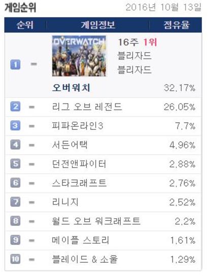 PC방 점유율 분석기관 게임트릭스에 따르면, 오버워치는 지난 13일 기준 32.17%로 PC방 점유율 1위를 차지했다. 2위인 LOL의 점유율은 26.05%로 두 게임의 격차는 6%를 넘어서고 있는 상황이다.