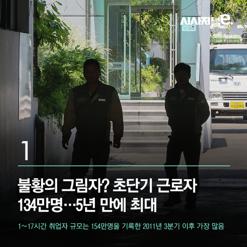 불황의 그림자?…초단기 근로자, 5년 만에 최대 저작권자 © 시사저널e 무단전재 및 재배포 금지 김재일 기자 kojell@sisajournal-e.com 페이스북 인스타그램 유튜브 이메일(으)로 기사보내기 다른 공유 찾기 기사스크랩하기 개의 댓글 회원로그인 댓글 내용입력 댓글 정렬 최신순 추천순 답글순 BEST댓글 BEST 댓글 답글과 추천수를 합산하여 자동으로 노출됩니다. 닫기 더보기 댓글삭제 삭제한 댓글은 다시 복구할 수 없습니다. 그래도 삭제하시겠습니까? 비밀번호 닫기 댓글수정 댓글 수정은 작성 후 1분내에만 가능합니다. 본문 / 400 비밀번호 닫기 내 댓글 모음 닫기