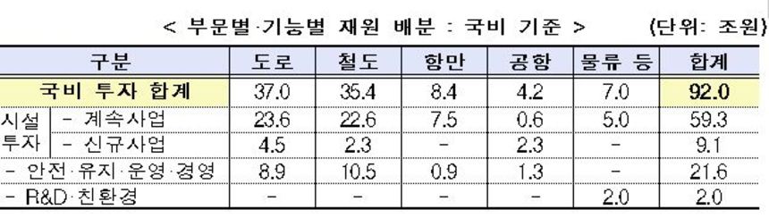 투자계획 사업비는 도로‧항만‧공항 등 부문별 SOC에 고루 투자된다.