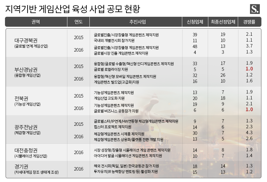 정부가 추진 중인 ‘지역기반 게임산업 육성’ 사업을 개선해야 한다는 목소리가 나왔다. 현재 해당 공모사업 대부분이 경쟁률 2:1을 넘지 못하고 있다. 경쟁력 없는 아이디어나 업체가 선정될 확률이 높은 상황이다. 결국 사업 성과 부실과 결과물의 질 저하로 이어질 수 있다는 비판이 나오는 것도 그래서다.