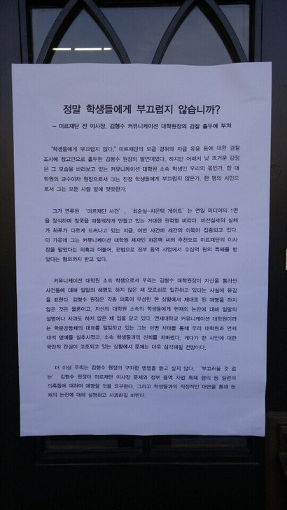 학생들은 “‘부끄러울 것 없는’ 김형수 원장이 미르재단 이사장 문제와 정부 용역 사업 특혜 혐의 등 일련의 의혹들에 대하여 해명할 것을 요구한다. 그리고 학생들과의 직접적인 대면을 통해 현재의 논란에 대해 설명하고 사과하길 바란다”며 글을 마무리했다.