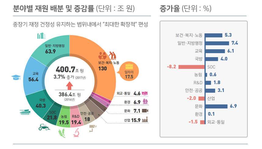 정부 예산안이 사상 처음으로 400조원을 넘어섰다. 정부가 예산안 핵심으로 꼽은 일자리 예산의 규모는 지난해보다 10.7% 증가한 17조5000억원이다.