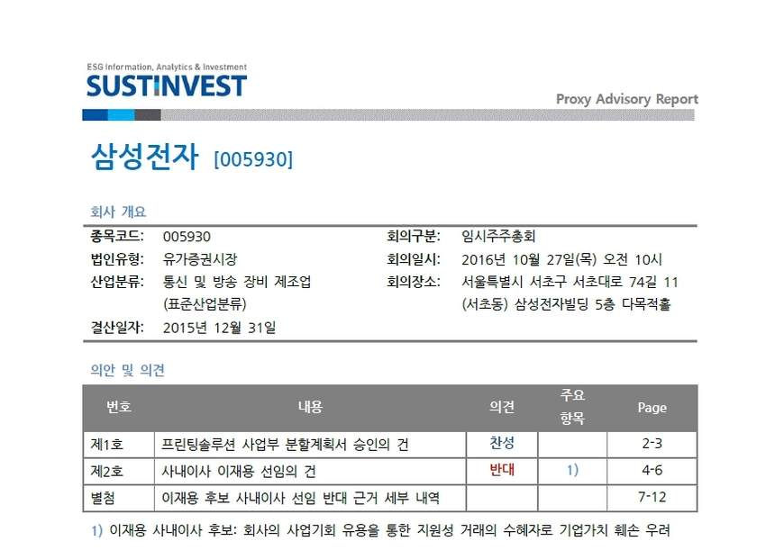 국내 의결권 자문사 서스틴베스트가 국내외 기관투자자에게 27일 삼성전자 임시주총에서 이재용 부회장의 등기이사 선임 안건에 반대할 것을 권고했다. 서스틴베스트는 24일 발표한 보고서에 3쪽 걸쳐 "이재용 부회장이 회사의 사업기회를 유용한 지원성 거래의 수혜자라 (그가 등기이사에 선임되면) 기업 가치를 훼손할 우려가 있다"며 "이에 사내이사 이재용 선임의 건 반대한다"고 밝혔다.