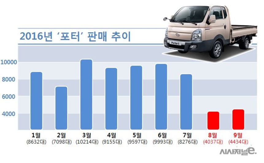 현대자동차 소형트럭 포터가 부진 늪에 빠졌다. 9월부터 새 환경기준인 유로6가 적용되며 차량 가격이 인상된 탓에 판매량이 7월 이후 절반으로 주저 앉았다. 포터에 각종 사양을 확대적용하며 소상공인 마음잡기에 나섰던 현대차 전략은 무용지물이 됐다.