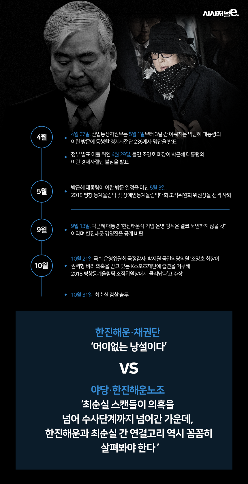 해운업계와 정치권에서는 ‘지라시’ 같던 최순실 스캔들이 의혹을 넘어 수사단계까지 넘어간 가운데, 한진해운과 최순실 간 연결고리 역시 꼼꼼히 살펴봐야 한다는 주장이 나온다. 최씨가 한진해운 법정관리에 직접적인 영향력을 행사하지 않았더라도, 비선실세가 조 회장에 악감정을 가지고 있었다는 사실 하나로 한진해운 법정관리 결정에 간접적인 영향을 미쳤을 수 있다는 것이다.