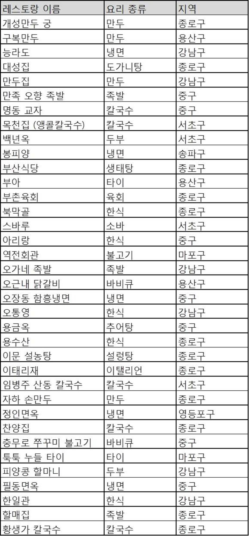 공개된 식당은 36곳이다. 목록을 보면 국내 대표적 계절음식인 냉면과 칼국수, 풍부한 육즙의 만두집, 쫄깃한 족발에서 추어탕, 생태탕 등 한식 분야가 대거 포함됐다. 또 최근 각광받는 이탈리안 요리, 타이요리, 일식 소바 식당 이름도 눈길을 끈다.