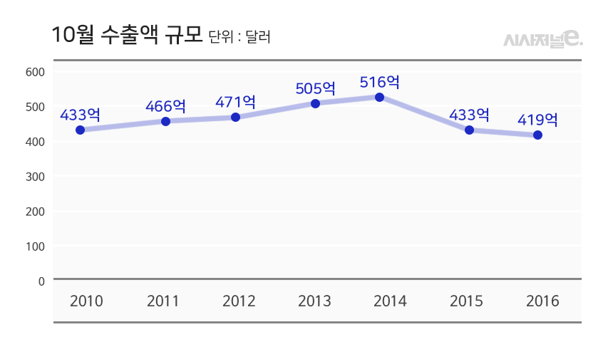 10월 기준으로 2010년 수출액은 약 433억 달러에서 2014년 516억 달러까지 지속적으로 증가하다가 지난해 2010년 수준인 433억 달러로 급감했다. 지난달 수출액은 그보다 3.2% 감소한 419억 달러였다.