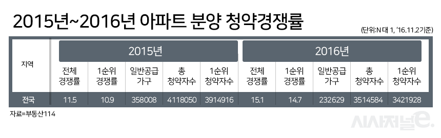 실제 부산지역 아파트 평균 청약경쟁률은 2015년 79.5 대 1에서 2016년 106.8 대 1로 더욱 과열양상을 보이며 올해 11월 2일 기준 약 117만명이 청약시장에 유입된 바 있다.