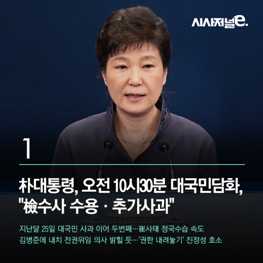 朴대통령, 오전 10시30분 대국민담화…"檢수사 수용·추가사과" 저작권자 © 시사저널e 무단전재 및 재배포 금지 김재일 기자 kojell@sisajournal-e.com 페이스북 인스타그램 유튜브 이메일(으)로 기사보내기 다른 공유 찾기 기사스크랩하기