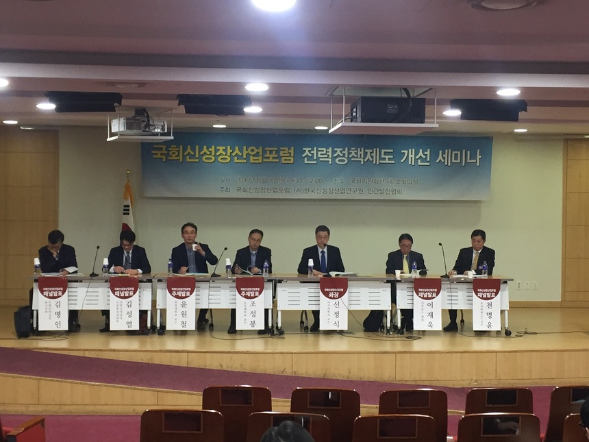 국회신성장산업포럼· 한국신성장산업연구원·민간발접협회가 3일 국회 의원회관에서 주최한 ‘전력정책제도 개선 세미나’가 열렸다. 세미나 참석자들은 산업통상자원부와 한국전력에 ▲발전사업 진입장벽 완화를 통한 경쟁도입 ▲예측과 전망에 중점을 둔 전력기본수급계획 수립 ▲한국전력에 대한 정부개입 축소 ▲요금제 다변화 등을 요구했다.