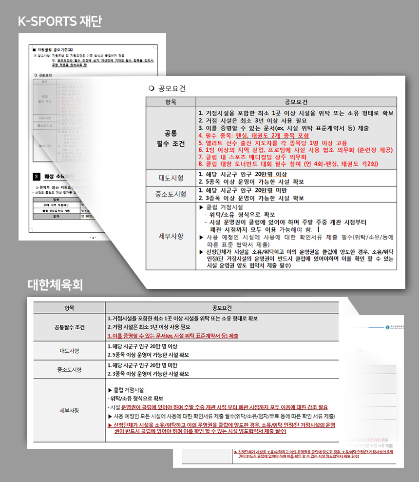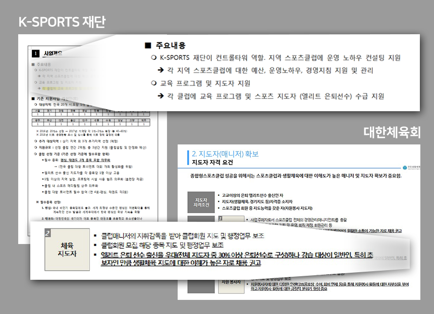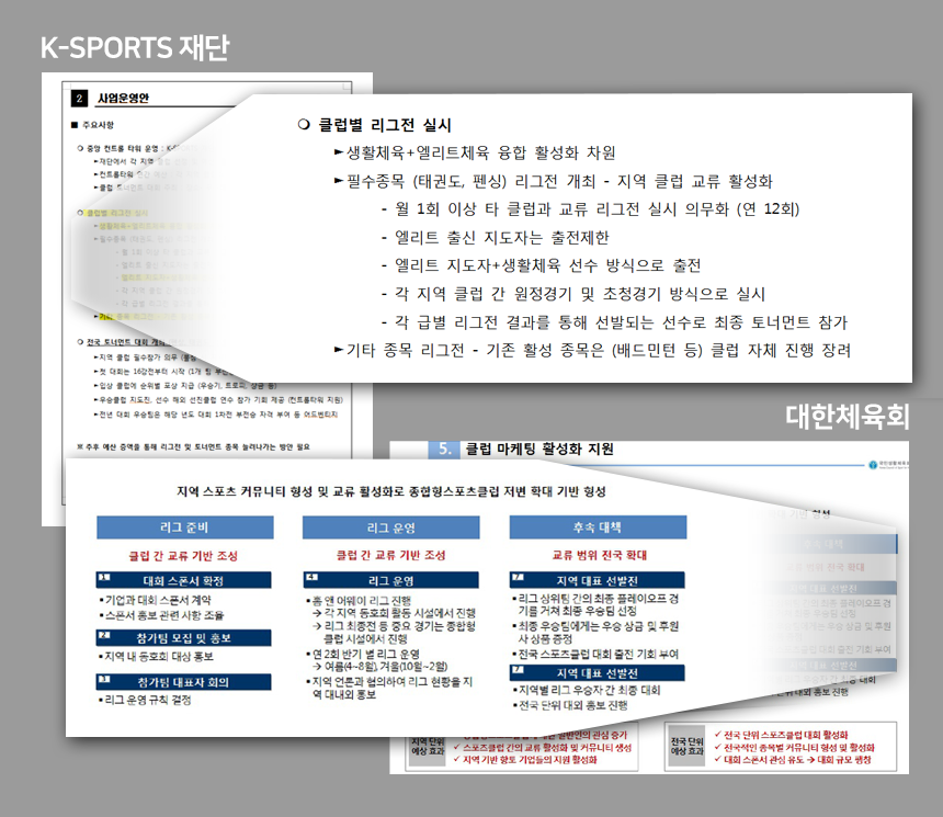 보고서는 지방자치단체 보조금에 의존하고 있는 대다수의 K스포츠클럽들이 재정 등에서 열악한 상황에 놓여 있다며 구조조정을 통해 자생력을 강화해야 한다고 강조했다. 여러 개선방안 중 하나로 클럽 간 리그전을 개최해 교류를 확대하고 선수출신의 지도자를 고용해 수업의 질을 높여야 한다고 주장했다. 이 같은 내용은 올 3월 K스포츠재단이 사업기획안으로 작성한 4장 분량의 ‘20개 시·도 스포츠클럽 지원사업 개선방안’의 사업운영안과 매우 흡사하다.