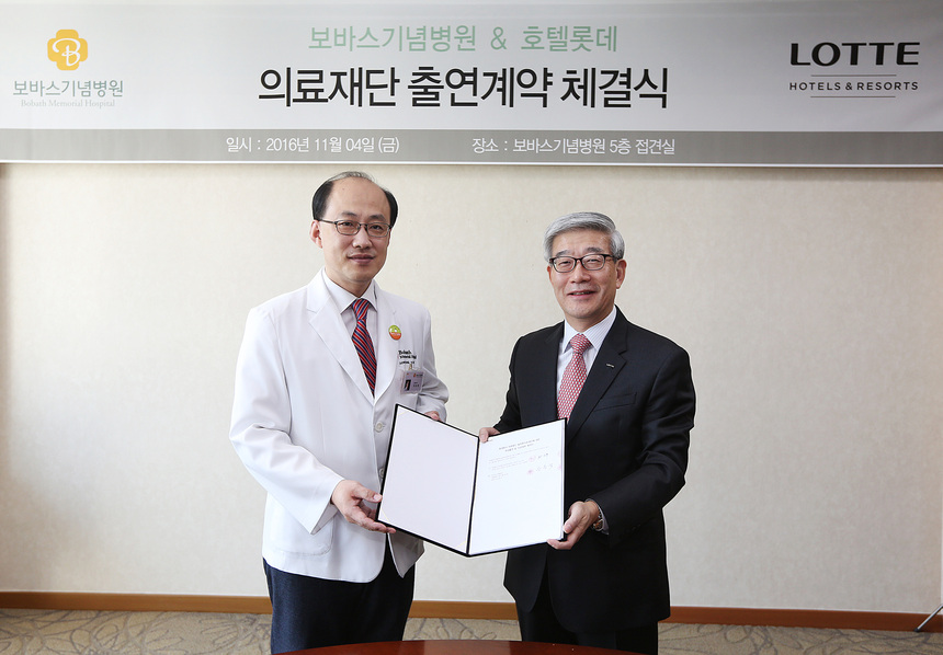 분당 보바스기념병원에서 진행된 출연 계약 체결식에는 송용덕 호텔롯데 대표이사 사장과 권순용 늘푸른의료재단 관리인, 임병연 롯데그룹 비젼전략실장 등 양사 관계자 20여명이 참석했다.