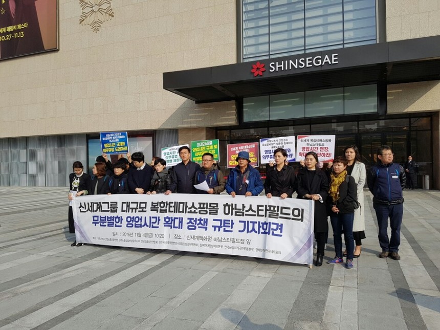 민주노총 전국서비스산업노동조합연맹, 시민단체, 신세계백화점 직원 일부는 4일 신세계백화점 스타필드하남점 앞에서 영업시간 확대를 규탄하고 이를 제한하는 입법을 촉구하는 기자회견을 가졌다.