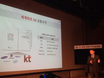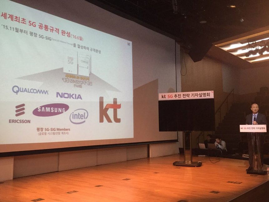 KT가 8일 5G통신 공통규격을 발표했다. 이 규격은 KT와 삼성전자, 인텔, 퀄컴, 노키아 등 5개 기업이 공유하고 있다. 이들 기업은 5G-SIG(Special Interest Group, 5G 규격협의체)로 협력하고 있다. KT는 협의체 의장국이다.