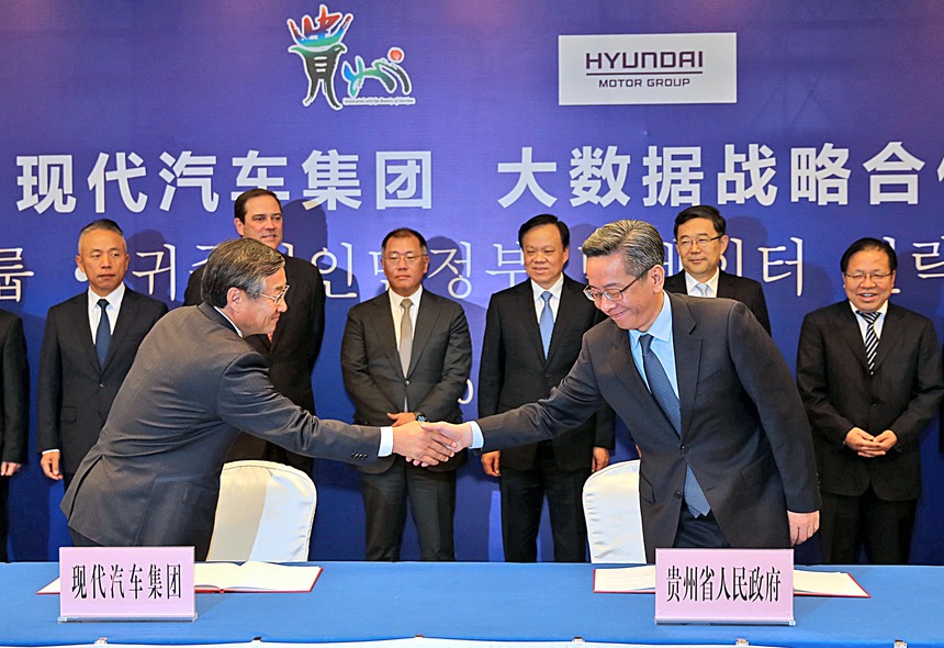 현대자동차는 8일(현지시각) 구이저우성 구이양(貴陽)시 국제생태회의센터에서 천민얼(陳敏爾) 구이저우성 당서기와 정의선 부회장을 비롯 양측 관계자들이 참석한 가운데 현대차 빅데이터센터 구축을 위한 ‘전략 합작 협의서'를 공식 체결했다.