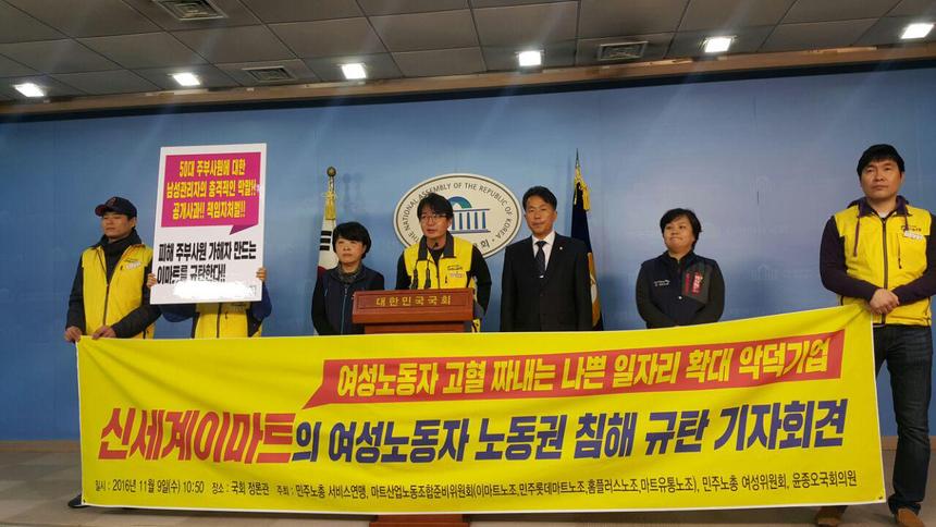 국회 미래창조과학방송통신위원회 소속 윤종오 의원은 “업계 1위 이마트가 좋은 일자리를 만들어야 한다는 사회적 책무를 다하지 못하고 있다”며 “좋은 일자리는 줄이고 부당한 노동탄압을 가해 노동자 활동을 위축시켰다”고 밝혔다.