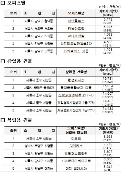 상업용 건물 1위는 서울 중구 신당동의 청평화시장으로 1㎡당 기준시가가 1678만1000원이었다. 복합용 건물은 서울 중구 신당동의 디오트가 836만3000원으로 가장 비쌌다.