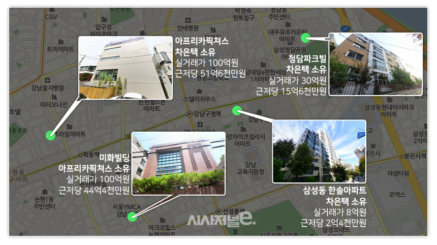 차씨가 소유한 청담파크빌 고급빌라와 아프리카픽쳐스 논현동 건물은 각각 2013년 7월9일과 2016년 1월 5일에 차씨 명의로 소유권이 이전됐다. 차씨가 청담동 빌라와 논현동 건물 가치만 100억원이 넘는다.