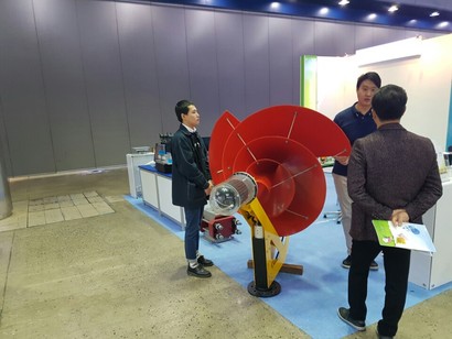 에너지신산업관 담당 기업들은 주로 풍력발전에 초점을 맞췄다. 에스티코알티에스는 나선형 소형 풍력 발전기를 선보였다. 바람이 블레이드를 따라 안쪽으로 들어가도록 설계한 것이 특징이다. 덕분에 어느 방향에서 바람이 불어도 손실되는 양이 적어 높은 효율을 낼 수 있다.