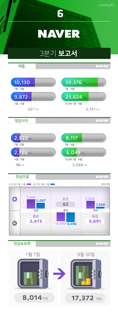 네이버는 3분기 영업활동 현금흐름으로 7541억원을 확보해 6033억원을 투자했다. 지난해보다 크게 늘어나지 않은 현금을 가지고 지난해와 비슷한 수준으로 투자한 것이다. 지난해 같은 기간 8014억원이었던 기말 현금 및 현금성 자산이 3분기말 현재 1조7372억으로 9357억원 늘어났다.