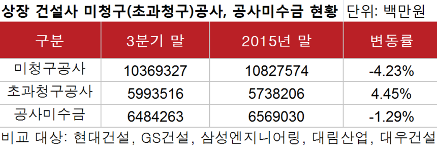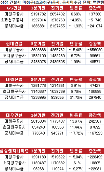 3분기 미청구공사, 공사미수금 줄었지만 감소폭 작아…초과청구공사는 되려 증가