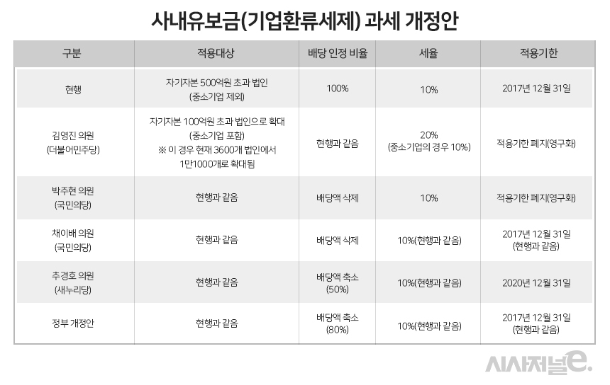 이와 관련해 국회 기획재정원회에는 총 5건의 개정안이 상정돼 있다. 추경호 새누리당 의원안은 기업들이 배당한 금액의 50%, 정부안은 80%만을 인정하자고 했다. 박주현·채이배 국민의당 의원은 배당금액 자체를 아예 인정하지 않는 방안을 발의했다. 김영진 더불어민주당 의원은 배당금액은 인정하되 적용대상 기업을 현행 자기자본 500억원 초과 법인(중소기업 제외)에서 100억원 초과 법인(중소기업 포함)으로 확대하는 방안을 냈다. 이 경우 사내유보금 과세의 적용대상 기업은 현재 3600개에서 1만1000개로 늘어난다.