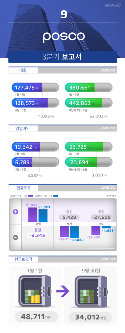 포스코는 3분기 매출 12조7475억원을 냈다. 지난해 같은 기간 13조9959억원 대비 1조2484원 줄었다. 영업이익은 1조342억원으로 지난해 같은 기간 6519억원 대비 3823억원 늘었다. 분기 영업이익 1조원 이상은 2012년 3분기 이후 4년만이다.