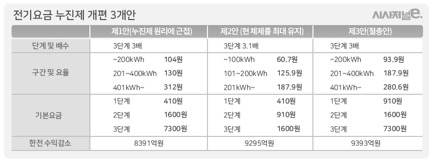 3안은 1안과 2안을 절충해서 내놓은 안이라는 점에서 가장 유력한 안으로 꼽힌다. 1안과 같이 1구간은 필수사용량(200kWh), 2구간은 평균사용량(400kWh)으로 나뉜다. 1단계는 현재 1~2단계 평균요율(93원/kwh)을 적용했으며, 2단계와 3단계는 현행 3단계(201∼300kWh)와 4단계(301∼400kWh) 요율인 187.9원과 280.6원을 적용했다.