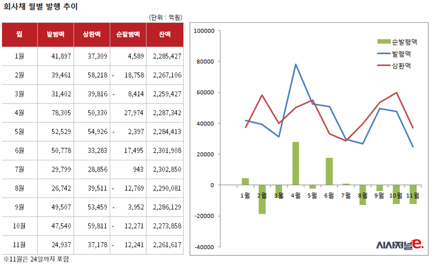 24일 금융투자협회에 따르면 11월 들어 이날까지 회사채 발행액은 2조4937억원으로 집계됐다. 회사채 상환액은 3조7178억원으로 발행액보다 1조2241억원 많았다. 회사채 시장이 이달도 순상환으로 마무리될 경우 지난 8월 이후 4개월 연속 순상환이 이어진다.